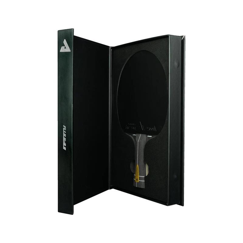 Muotoilu on yhtä vaikuttava kuin suorituskyky. Kahvassa oleva kultainen metallinen insertti on eksklusiivinen yksityiskohta, joka lisää mailan ensiluokkaista tuntumaa. Mattamusta kotelo, jossa on integroitu, näkymätön magneettisuljenta, toimii tukevana mailakotelona, joka tarjoaa sekä tyylikkään säilytyksen että optimaalisen suojan. Sisällä pöytätennismaila on suojavaahtomuovin ympäröimä, mikä lisää turvallisuutta.